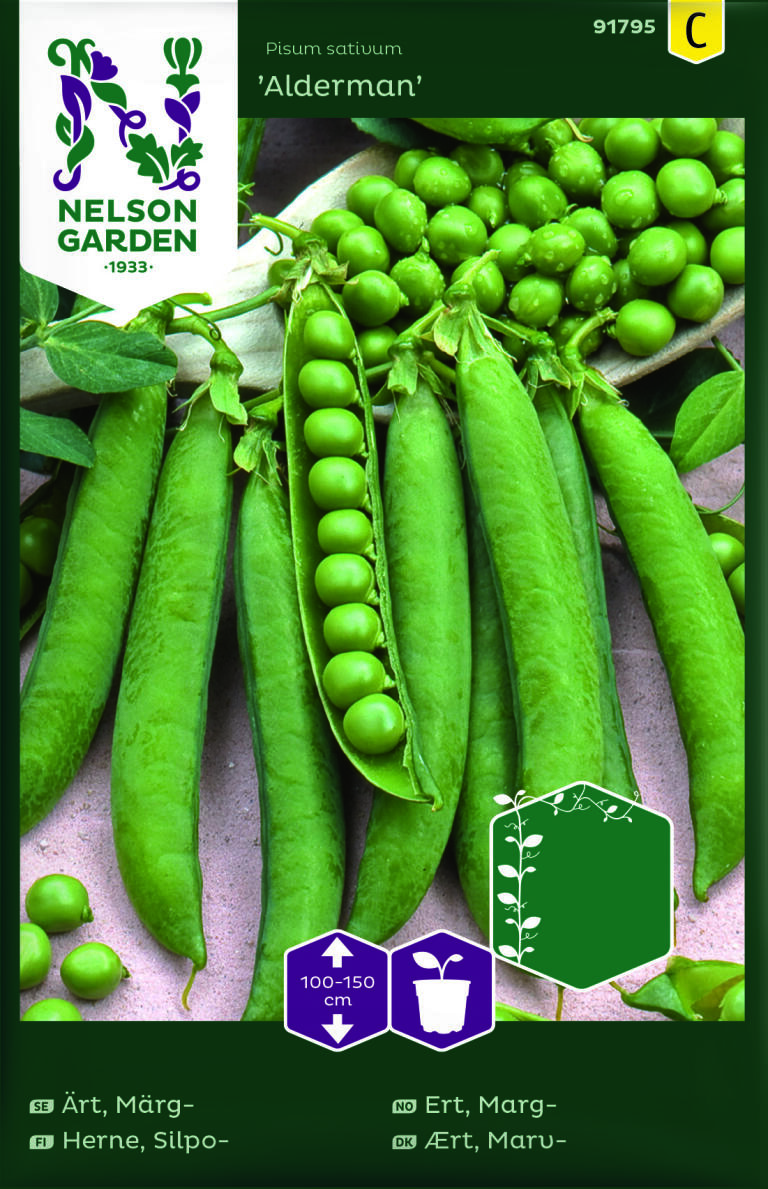 Marvært, som giver et stort udbytte, 7-10 ærter pr. bælg. Har brug for støtte. Høstes løbende og bælges. Dyrk gerne ærter forskellige steder i haven hvert år, de gøder jorden.