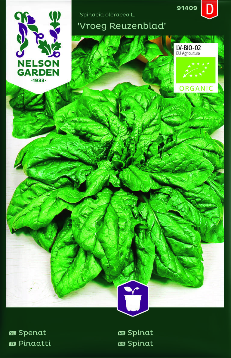 Økologiske frø. Spinat kan dyrkes på flere forskellige måder afhængigt af voksested og sæson. Rigt indhold af mineraler og vitaminer. Sorten giver rigeligt med mørkegrønne blade. Så gerne i flere omgange for at have god adgang til friske blade, men hold en pause i løbet af højsommeren, hvor planterne lettere går i blomst. Passer fint til nedfrysning. Trives bedst i muldrig, fugtbevarende jord, men klarer sig godt på de fleste jorde. Vand rigeligt.