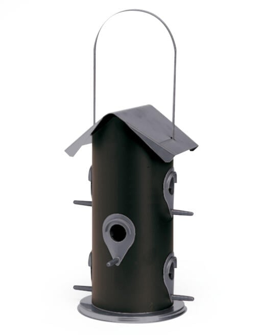 Stor foderautomat til fuglefrø. Tag og bund i grå, beholder i sort metal. 6 foderåbninger med siddepind i grå plast/metal. Påfyldes oppefra. Rummer ca. 3 liter. H 32 cm Ø 16 cm