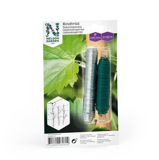 Galvaniseret og plastovertrukket ståltråd. Diameter 0,75 mm, længde 2 x 40 m.