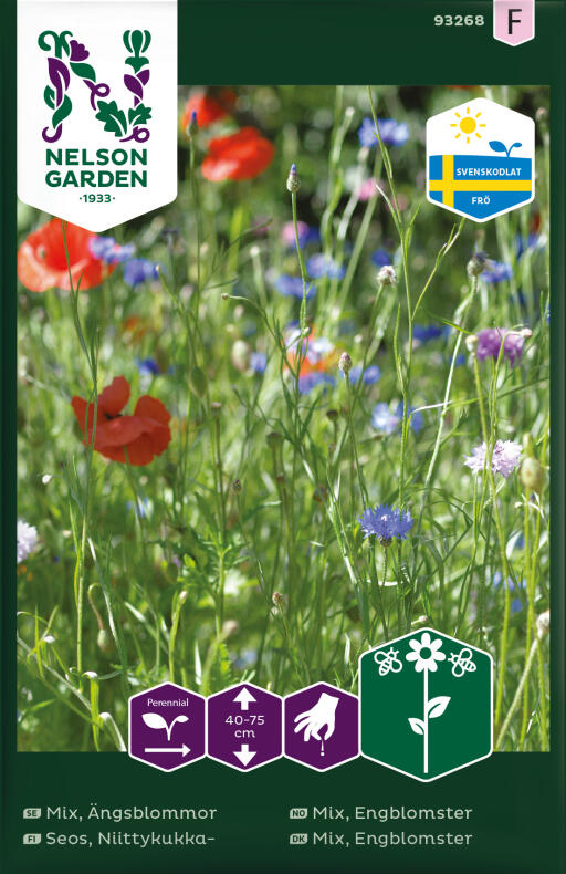 En blanding af engblomster, bl.a. blåklokke, hvid okseøje, kornblomst, blåhat. Lokker insekter til sig. Så frøene separat, bland dem ikke med græsfrø. Undgå gødning. Blomsterne slås først sidst på sommeren, de skal have lov at kaste deres frø