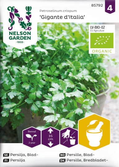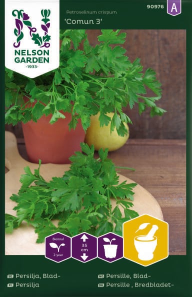 Bredbladet persille som er mere smagfuld end kruspersille. Spiringstid 2-4 uger. Høstes løbende, langt ud på efteråret. Kan fryses.