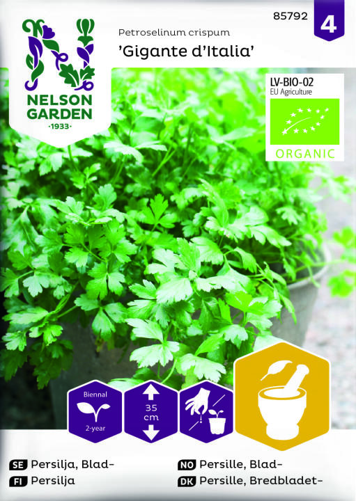 Økologiske frø. Persille med glatte blade , der gør den meget dekorativ. Høst blade efter behov og langt ud på efteråret. Planten overvintrer, i hvert fald i den sydlige del af landet. Derefter giver den en tidlig høst i år 2, før den går i blomst. Velegnet at nedfryse. Trives i en næringsrig og veldrænet jord. Vandes i tilfælde af tørke.