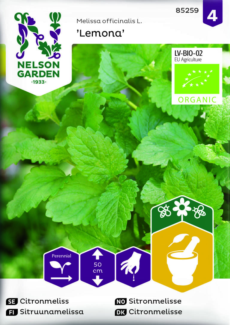 Økologiske frø. Citronmelisse er en dekorativ krydderurt med smukke grønne blade og hvide blomsterspirer. Dyrkes i en potte eller i et staudebed. Høst de citronduftende blade løbende. Bruges som krydderi og dekoration.