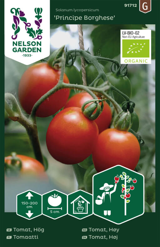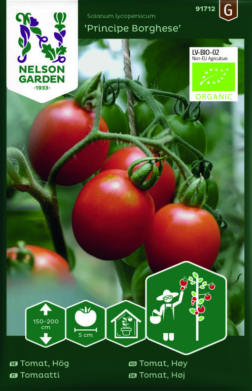 Økologisk frø. Cocktailtomaten 'Principe Borghese' er en italiensk tomatsort, der tåler meget varme og sol. I Italien soltørres tomaterne ved at hænge hele planten på hovedet på et luftigt, solrigt sted, indtil frugterne er blevet læderagtige og har fået en mere intens smag. I koldere klimaer kan de tørres i tørremaskine eller ovn. Klaserne kan klare sig i ugevis indendørs, og de bevarer smag og tekstur bedst ved stuetemperatur.