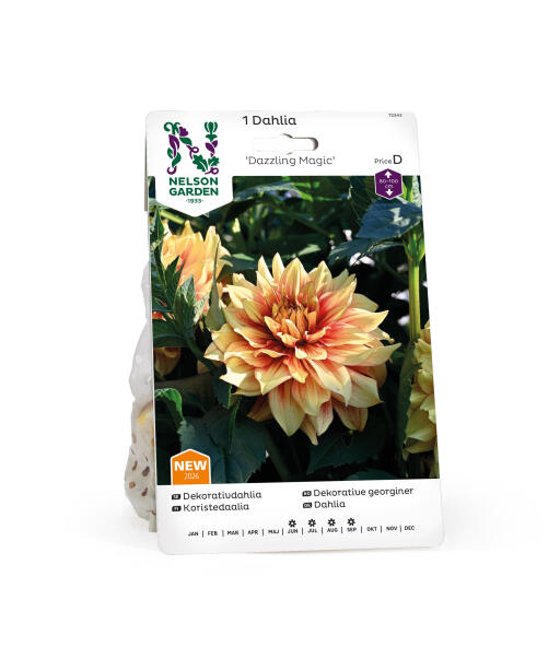 Smuk dahlia, der skifter farve fra rød til orange og gul. En skøn farvekombination i sensommerbuketten med sine smukke farveskift og stabile stilke.