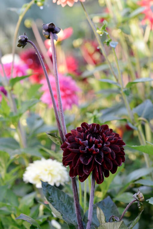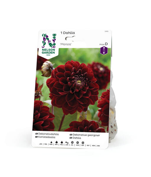 Pragtfuld dekorativ dahlia i en dyb mørkerød farve. Perfekt som en accent i et bed eller en buket med rustne og abrikosfarvede toner. På kraftige mørke stængler står den pænt i bedet og bliver en fremragende snitblomst