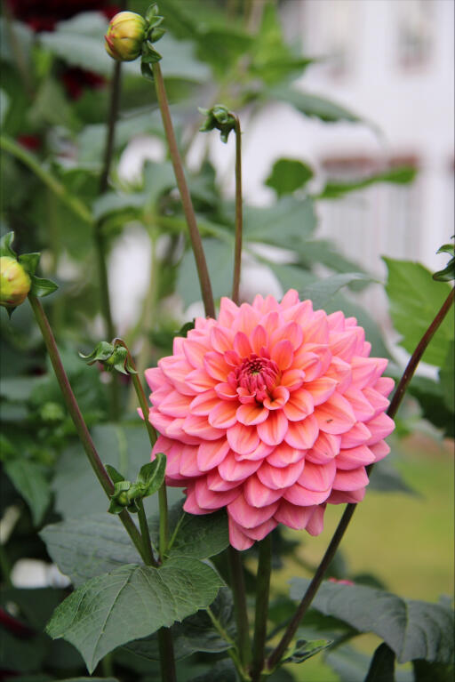 Smuk dahlia i en rosa nuance, der får en dybere farve, efterhånden som blomsten åbner sig. 'Salmon Runner' får ofte flere blomster på samme stærke stilk.