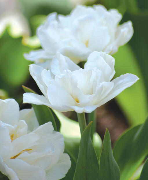 En tidligt blomstrende tulipan med udsøgte fluffy, hvide blomster som svæver som skyer i beddet. Dobbelte blomsterblade åbner sig op til en blød skålformet blomst med gul midte. Mondial har også en mild duft.