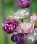 Smukt fyldte tulipaner i hvideste hvid, sød rosa og lækker rødlilla. Romantisk farveskala, mild duft og flere lag af blomsterblade gør denne kombination til noget særligt. Fremragende som snitblomst; umuligt at modstå en sådan buket!