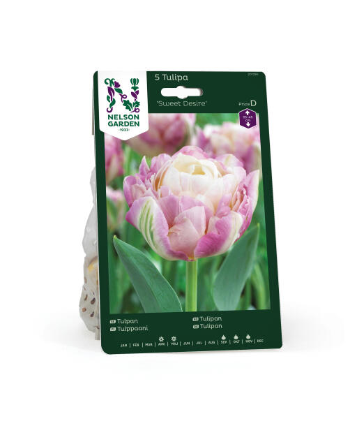 Sød som sukker er denne tulipan med flere lag af blomsterblade, der går over fra lys lilla og rosa til en cremet hvid midte. De ydre blomsterblade har dekorative grønne striber. Vidunderligt sød i potten, men passer også i beddet og som snitblomst.