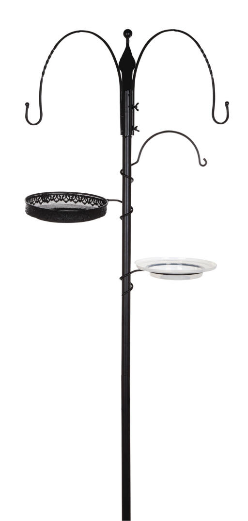 Praktisk stativ til foderautomater med 3 kroge, 2 af krogene er faste, fuglebad og foderbræt med netbund. Sort metalstang (fire dele) kan monteres i den ønskede højde. Støtteben medfølger og kan monteres efter behov. 50 x 247 cm (maks højde)
