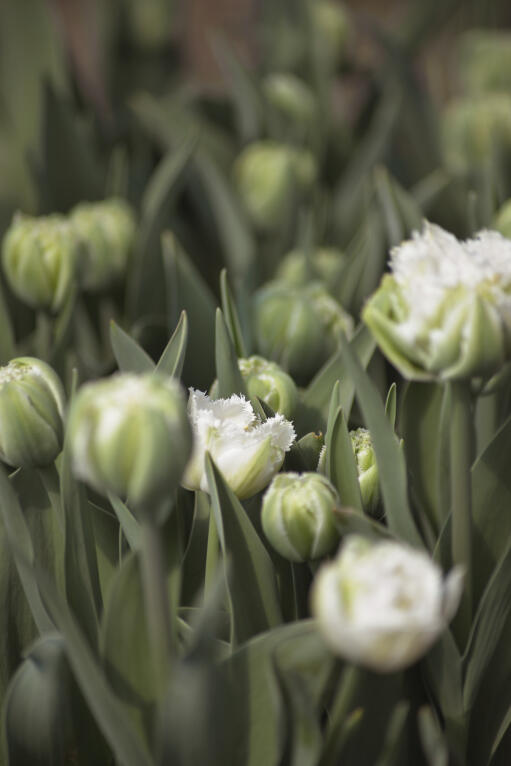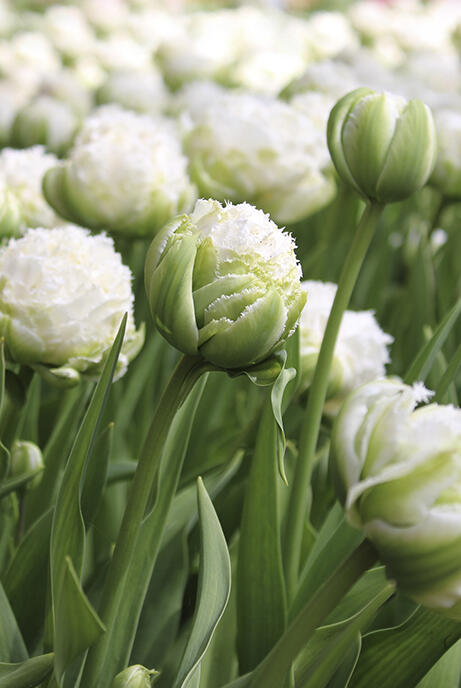 En spektakulær dobbelt frynsetulipan med tætte, kridhvide blomster, der leder tankerne hen på snebolde og glitrende krystaller. Flot i både bed og buket.