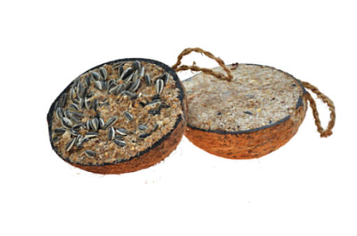 Udhulet halv kokosnød, som er blevet fyldt med fedt, korn og frø. Meget energirig og derfor populær hos vilde fugle. Ca. 330 g