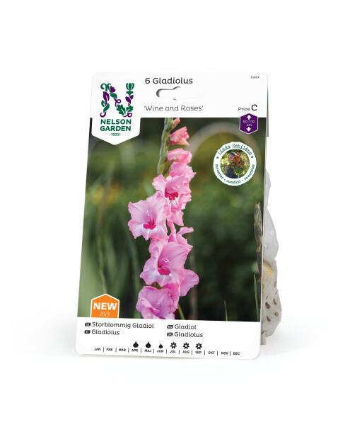 Trompetformede blomster med en dejlig kontrast mellem dens hindbærrøde centrum og søde lyserøde blade. Stænglerne af denne storslåede gladiolus kan blive op til 120 cm høje. Flot i både blomsterbed og buket.