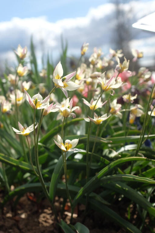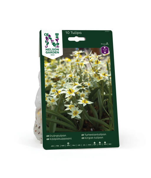 Kirgisisk tulipan blomstrer rigeligt og får ofte flere blomster på hver stængel. Blomsterne, der åbner sig til en hvid stjerne, er hvide på indersiden med gult centrum. Ydersiden af blomsterbladene er svagt gråviolette med gul basis.