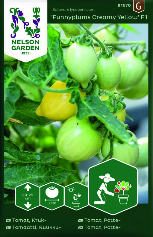 'Funnyplums Creamy Yellow' er en spændende sort, da planten bliver så lille og sød. Frugterne er cremegule og blommeformede.