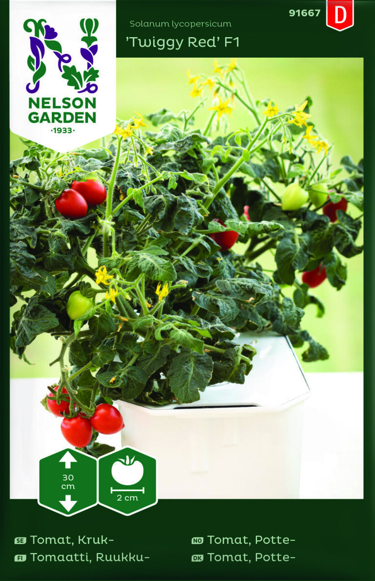 Pottetomaten 'Twiggy Red' F1 er en sjov tomat at dyrke på køkkenbordet eller i en potte på altanen eller i haven. Lækker snacktomat til børn, da de nemt selv kan plukke dem. Smagen gør den anvendelig til meget.