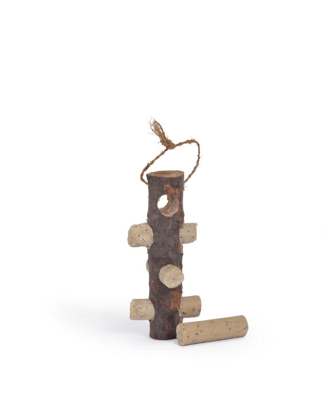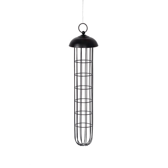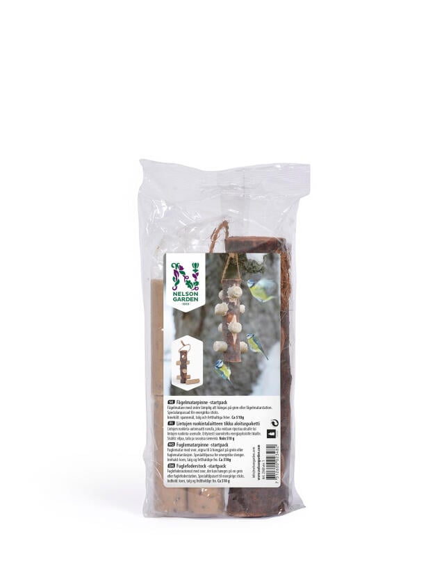 En dekorativ kogle fyldt med talg, olierige frø, majs og proteinrige fluelarver fra sort soldaterflue. En anderledes, men meget næringsrig anretning på de små fugles havebuffet.