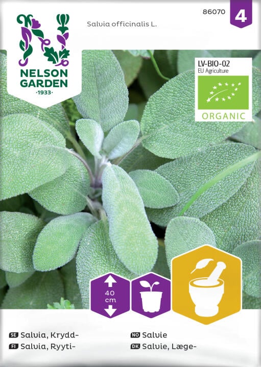 Økologiske frø. Salvie er en aromatisk krydderplante med sølvgrønne, let lodne blade. Høst bladene efter behov, og brug dem friske eller tørrede, måske til en god kyllingefilet med bacon.