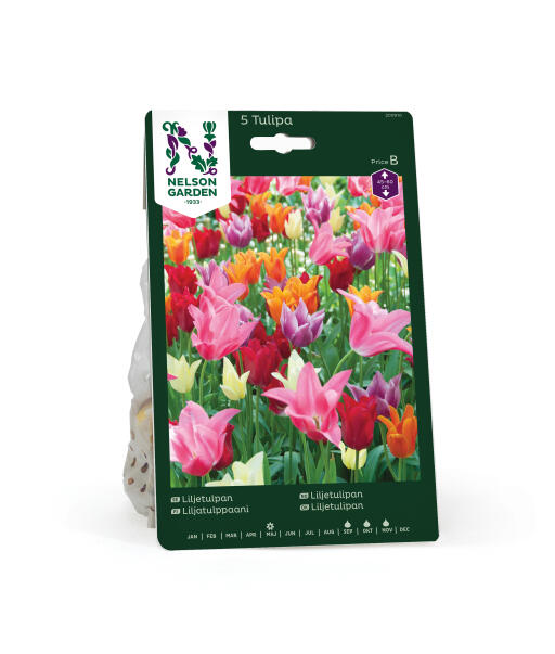 Blanding af liljetulipaner i lækre farver. Blomsterne har en elegant form og plejer at stå længe. De er sentblomstrende, og er foråret køligt, kan de blomstre langt ind i juni. Særdeles god som snitblomst.