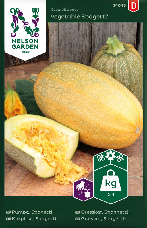 Spændende, gult græskar; frugtkødet ligner og spises som spaghetti. Kan lagres et køligt sted i 1-2 mdr. Trives et varmt og solrigt sted i velgødet og veldrænet jord. Kræver meget vand og gødning.