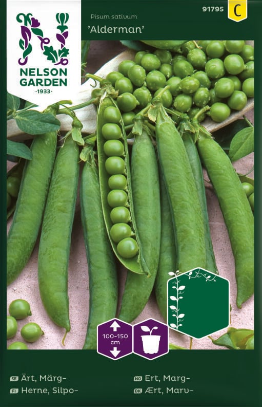 Marvært, som giver et stort udbytte, 7-10 ærter pr. bælg. Har brug for støtte. Høstes løbende og bælges. Dyrk gerne ærter forskellige steder i haven hvert år, de gøder jorden.