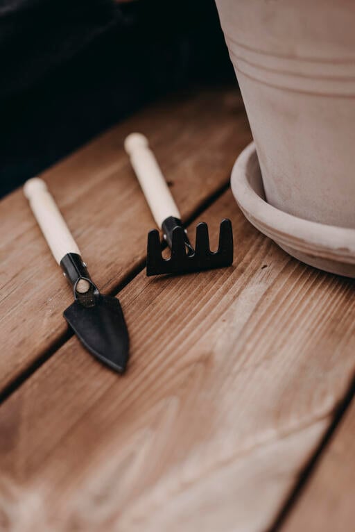 Flot omplantningssæt. Indeholder minispade, minirive og prikpind.