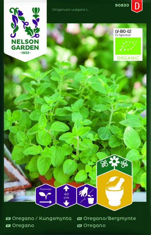 Økologiske frø. Oregano er en aromatisk krydderurt med blå blomster. Høst bladene løbende og brug dem friske eller høst hele kviste til tørring. Dejligt krydderi over tomater og fetaost.