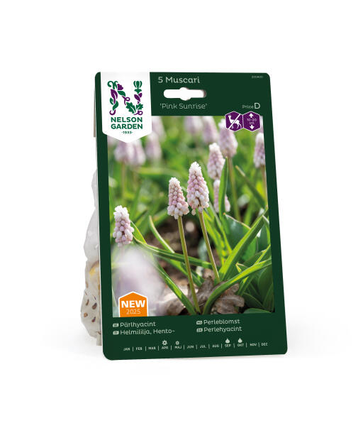Unik lyserød, prisbelønnet perlehyacint, som blev rost af Royal Horticultural Society, da den blev lanceret. Blomsterne er kompakte med lyserøde blomsterklynger, der bliver næsten hvide i toppen. Værdsat af humlebier, bier og sommerfugle, da de er fulde af nektar tidligt på foråret.