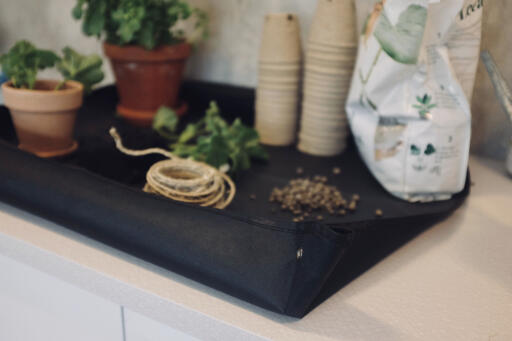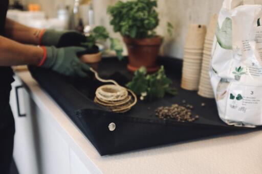 Plantemåtte til nem og ren plantning. Plantemåtte, der gør det nemt at holde køkkenbordet, altanen eller terrassen ren under plantning. Læg måtten over underlaget, og brug trykknapperne til at skabe hævede kanter, der holder jord og plantedele på plads. Den vandafvisende tekstiloverflade er nem at rengøre, og måtten kan foldes sammen for nem opbevaring.