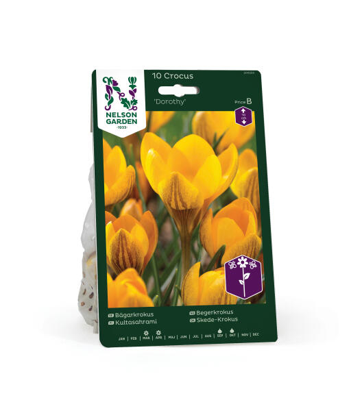 'Dorothy' er en køn lille duftende skede-krokus, som gerne kommer igen år efter år. Blomsterne er smukke gule med brune, mørke striber. Velegnet sort til tidlig blomstring i krukke.