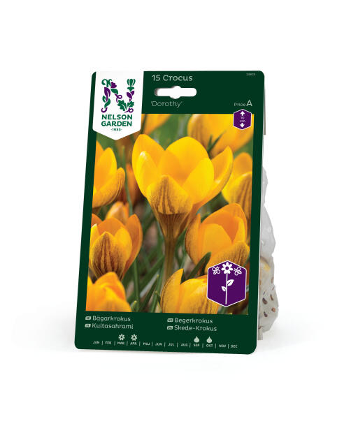 'Dorothy' er en køn lille duftende skede-krokus, som gerne kommer igen år efter år. Blomsterne er smukke gule med brune, mørke striber. Velegnet sort til tidlig blomstring i krukke.