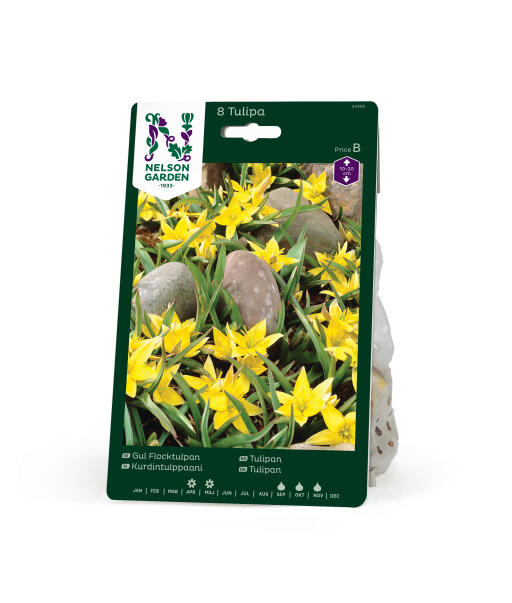 Den perfekte, lave tulipan til tidligt forårsblomstrende bede og stenpartier. Over de dunkle, grådunede blade breder stjerneformede, knaldgule blomster sig ud, ofte to fra hver stilk! Efter blomstringen udvikles dekorative frøstande.