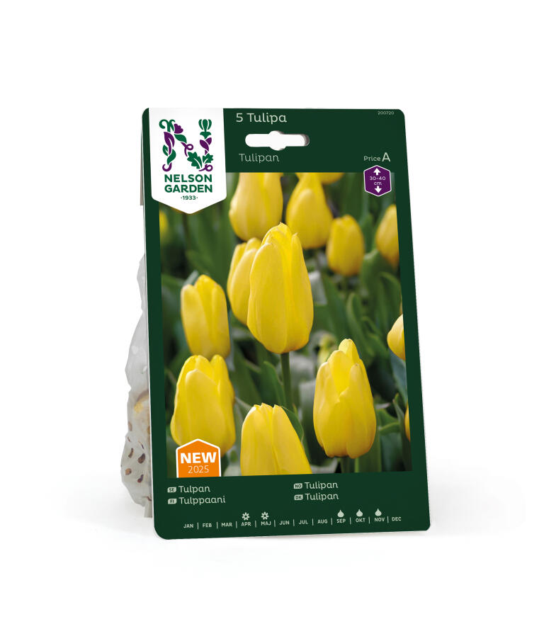 En klassisk solgul tulipan på en stabil stilk med en enkel og smuk blomsterform. Blomsterne er relativt store, gule som solen og holder længe. Også smuk som snitblomst i buketter.