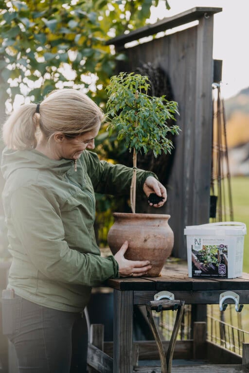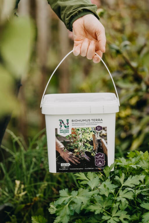 Ved plantning i større potter og krukker blandes en del Biohumus Terra med 50 liter jord.