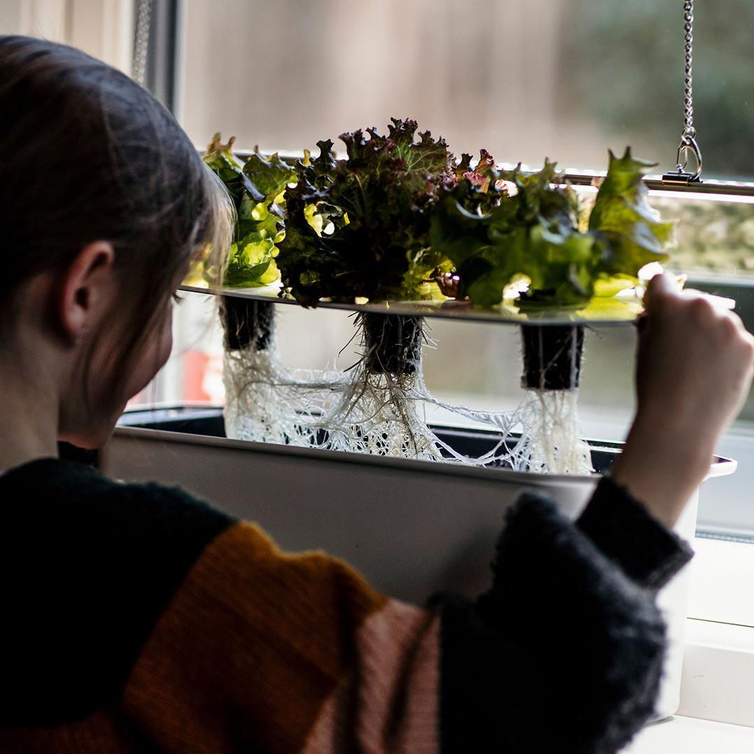 Det er nemt og hurtigt at dyrke hydroponisk. Bliv selvforsynende med krydderurter og salat. Skab din egen have indendørs, i vindueskarmen eller på køkkenbordet. På blot få uger er du ofte klar til at høste.